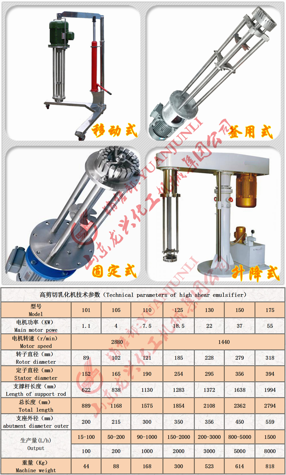 山東萊州高剪切分散乳化機根據應用工況可分為移動式高剪切分散乳化機以及升降式高剪切分散乳化機和固定式高剪切分散乳罐,龍興集團為您供101-150型系列移動式高剪切分散乳化機。